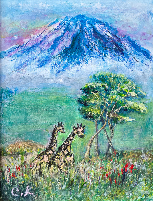 「キリマンジェロが見える、今日はいい日だ!」と言ってたかどうか。次々とキリマンジェロに向かって走るホテルのスタッフ。到着したばかりの私たちの荷物は放り出して・・・。キリマンジェロは「白く輝く山」とか「神の山」といわれる。姿を現した「神の山」に向かって走る幸福そうな笑顔に、私たち(国連女性会議参加の大阪グループ)は、ある種の感動でしばし立ち尽くしていた。ケニアのサハリパークホテル。パーク内にコテージが分散していて、朝起きるやいなや、キリンの親子がヌーっと柵の向こうから顔をのぞかせたのです。「ほんと、おったまげた!」1985年の夏でした。