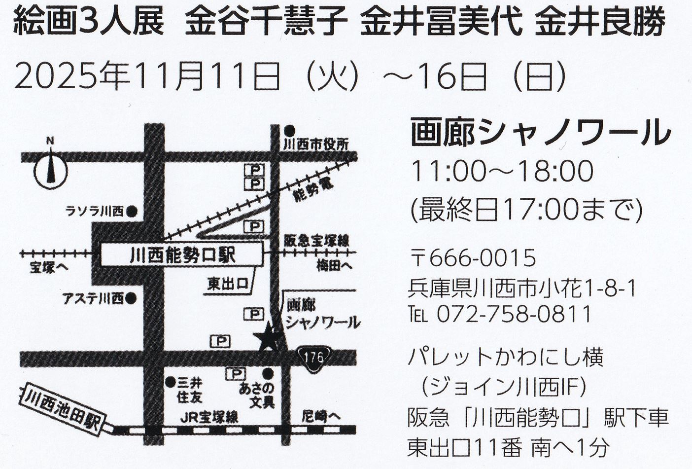 1 今回のブログは、「展覧会」のお知らせをもって代えさせていただきます。11月11日(火)~16日(日)、「絵画3人展」を開催いたします。場所は兵庫県川西市「パレットかわにし」横、「画廊シャノワール」です。お時間の都合がつきましたら、どうかお運びくださいませ(添付1)。私は11月12日(水)PM2時~6時、11月15日(土)PM2時~6時、11月16日(日)PM2時~5時最終日)に在室予定です。