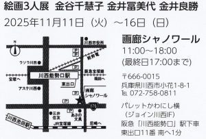 11月11日(火)~16日(日)、「絵画3人展」を開催いたします。場所は兵庫県川西市「パレットかわにし」横、「画廊シャノワール」です。お時間の都合がつきましたら、どうかお運びくださいませ。私は11月12日(水)PM2時~6時、11月15日(土)PM2時~6時、11月16日(日)PM2時~5時最終日)に在室予定です。お待ちしています。