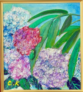 その3 花園を行く「紫陽花の花」 oil&アクリル 色紙サイズ