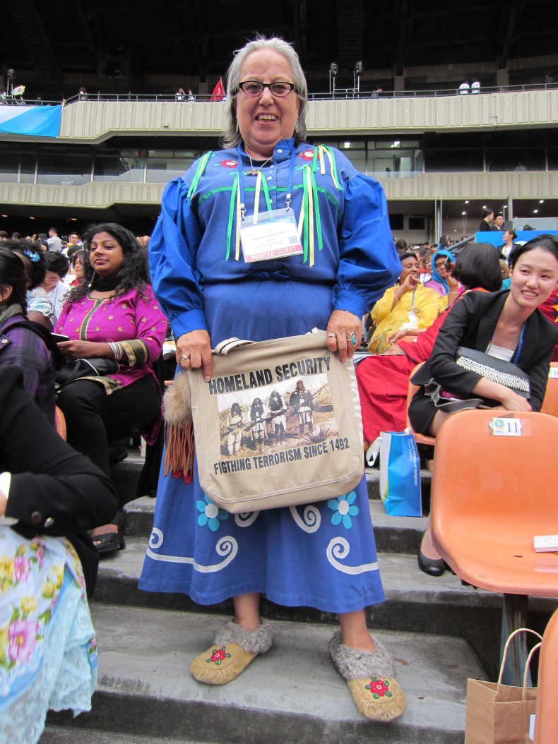ソウルのオリンピック競技場でオープニングが開催されました。私の前列にさっきから、興味のあるバッグを持っている女性がいます。「ホームタウンを守れ!1942年以来ずっと、侵害の恐怖と戦っている!」というメッセージとインディアンの人たちが銃を構えている写真のバッグです。写真を撮らせてもらいました。毛皮の靴も履いてもらいました。インディアンと呼ばれる人々は数千年も昔から北米大陸全土に住んでいて、自然と共生しながら独自の生活様式や文化・芸術を築いてきました。1492年にアメリカ大陸にやってきたコロンブス(と残忍なスペイン人達)が、そこをインドと思い違いし、先住民を”インディアン(インド人)”と呼んだのが、名前の由来です。現在は”インディアン”という言葉は差別用語として捉えられていますが、あえてこの呼び名に誇りを持ち、自身をインディアンと呼ぶ人も少なくありません。カナダにもインディアンがいますが、カナダでは一般的にファーストネイションズと呼ばれています。
