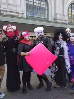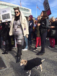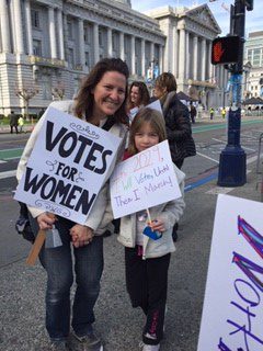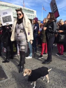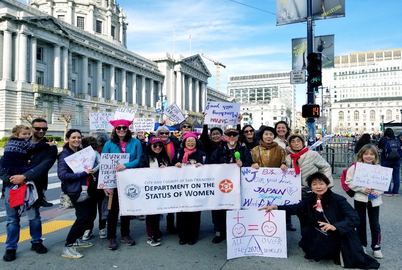 そろそろ出発か。青空が美しい。音楽があちこちで奏でられる。踊りが始まる。派手、派手衣装の一団はゲイ・ピープルだという。手づくりのプラカードが動く。男性の参加者も多い。子連れもたくさんいる。犬といっしょの参加も多い。犬をおんぶしている女性もいる。車椅子も。年齢も人種も千差万別ながら、切羽詰まったデモという感じではなく、挨拶しながら、写真を撮りながら、笑いながら、余裕で、誰もがお互いを気づかいながら、ゆっくり歩く。ハイキングみたいだなって感じです。「日本から参加しています。女性の力を示そう」というプラカードをみてメディアから「こっちを向いてください」とフラッシュを浴びることが何度もありました。私たちは、あらかじめ*NPO「Department on the Status of Women(サンフランシスコ女性の地位部局)でプラカードの作成などをさせてもらい、一緒に参加させてもらいました。ディレクター、ミリー・M・ムラセさんからこの写真を送ってもらいました。