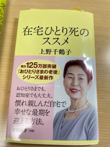 ご紹介するお二人のうち、上野千鶴子さんははっきりと「施設でもなく、病院でもなく大好きな自宅で自分らしい幸せな最後を迎えたい。その心準備と心構えをお伝えします。「おひとり様の最後」を支える医療・介護・見取りの最前線も紹介。いがいとお金もかかりません。私、ウエノも、最後は「在宅一人死」でゆくつもりです」言明されています。