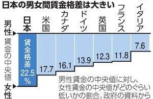 日本の男女間賃金格差が大きいのは、男性の賃金の中央値に比べ、女性の賃金の中央値がどのくらい低いかの割合を比較してみるとよくわかります、男女で共通した賃金基準ではないのです。さきごろ、岸田文雄首相は「新しい資本主義実現会議」で、企業に対し、男女間の賃金格差の開示を義務づけることを明らかにしました。「早急に女性活躍推進法の制度改正を実施し、男性の賃金に対する女性の賃金の割合を開示することを義務化する」と述べた。この夏には制度を始められるよう準備を進めるといいます。とにかく何からでも徹底して実現することです。