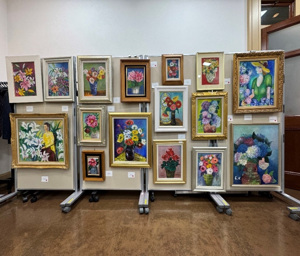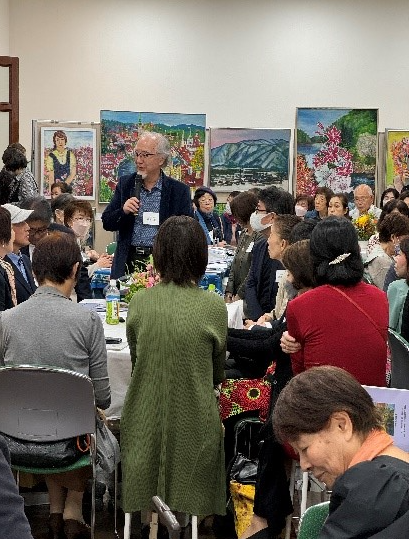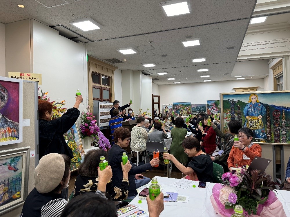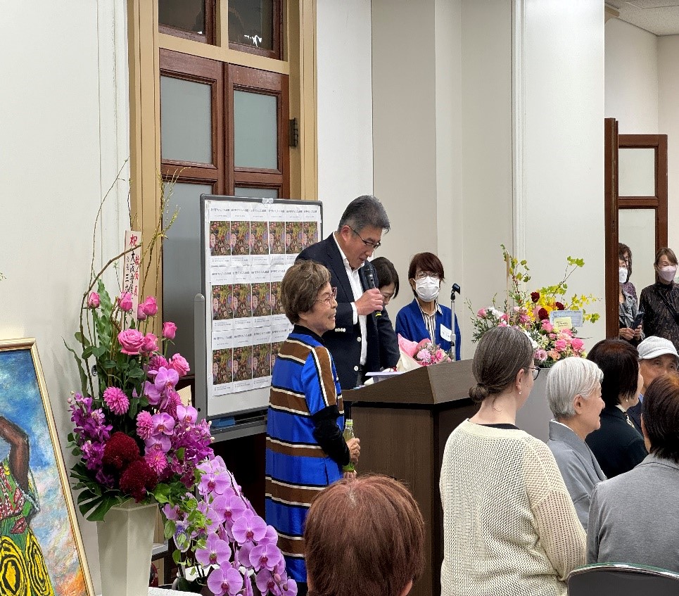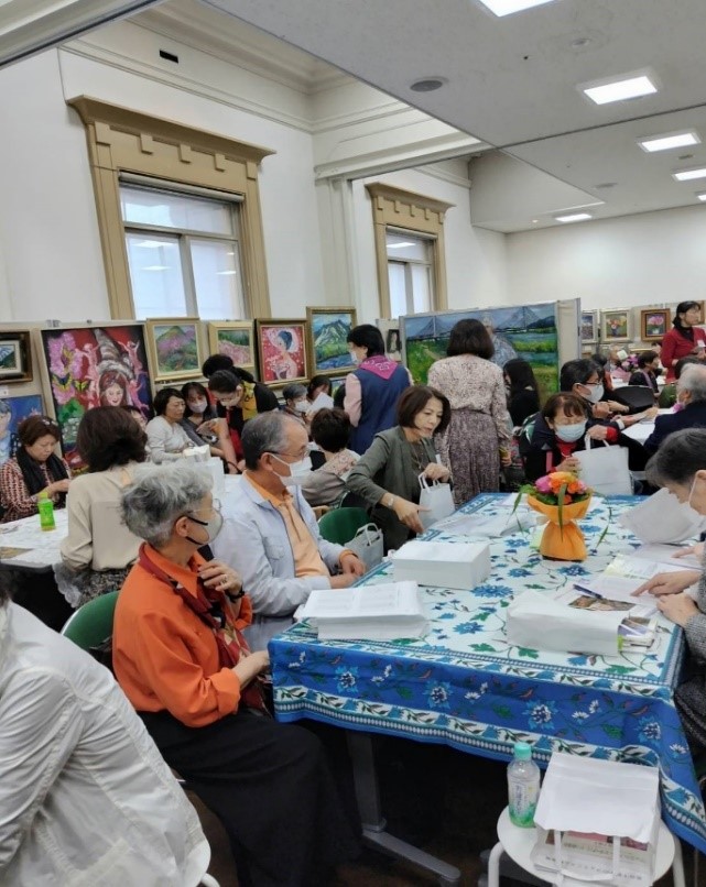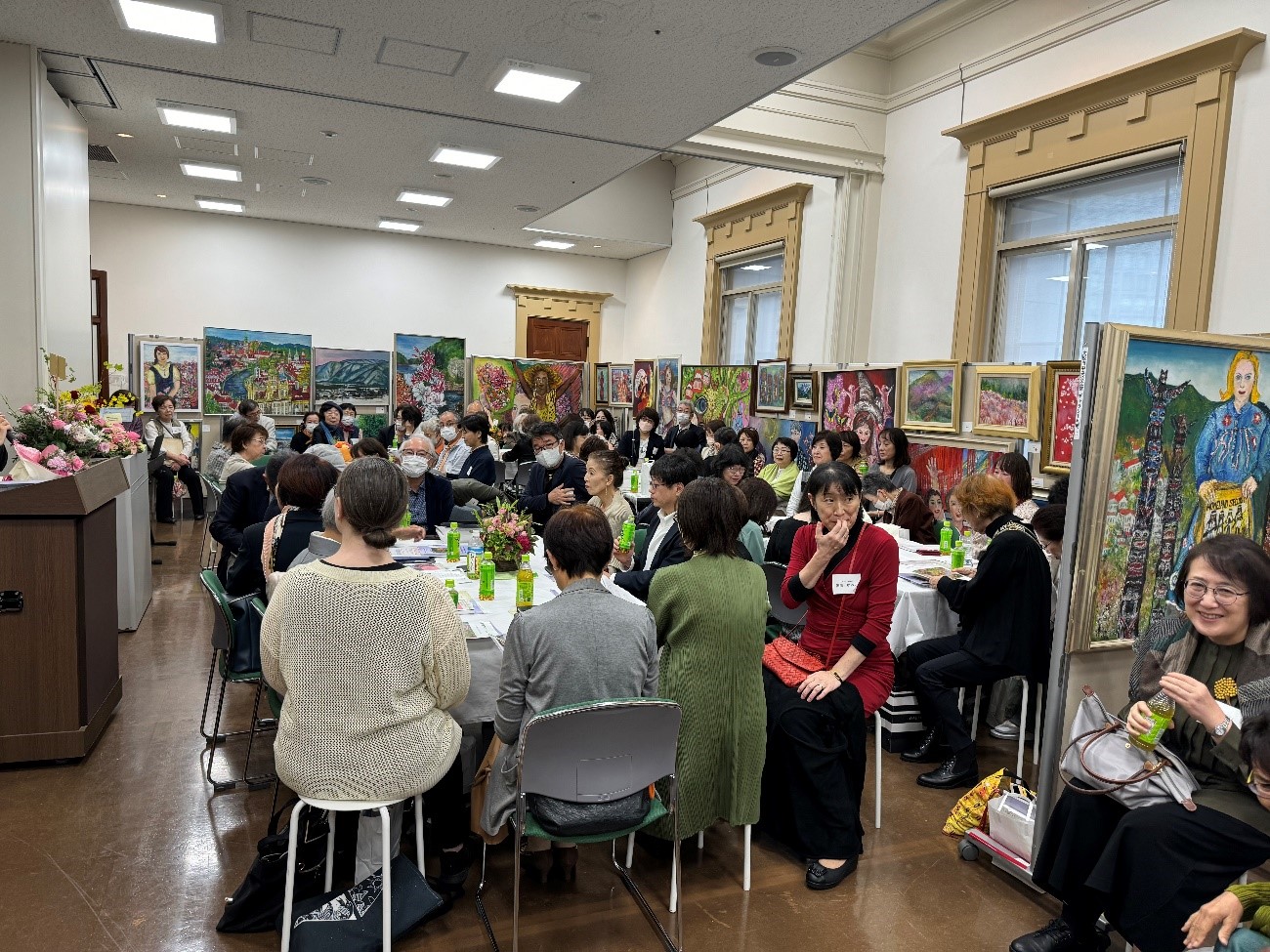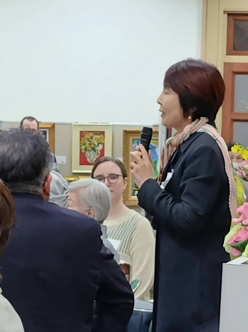 「ようこそお越しくださいました。お久しぶりです」「ほんと、ほんと」「展示作品の写真集を見ながら進んでくださいね」「最初は自画像の6点から始まります」「花の絵は一番多くて23点あります」「女性像を描いたものは15点、大型の作品が多いです。100号が3点、70号も4点あります。」(大型の作品は女流画家協会展入選が多い)