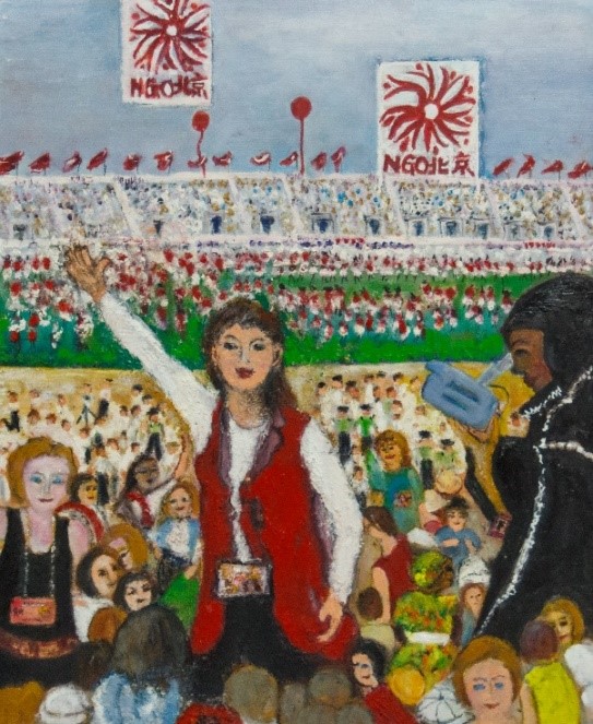 1980年の国際女性年中間年記念世界大会から4回連続、国際女性会議に参加しました。そのたびに世界に追いついていない日本の女性の現状を見せつけられましたが、かといってがっかりもせず、いつも「仲間がいる」「私も自分のできることを思う存分頑張ろう」と思いながら帰りの飛行機では元気百倍でした。この絵は、1995年第4回北京会議での私です。国連主催の歴史上最大規模(5万人)の世界女性会議がアジアで初めて開催されました。1975年国際女性年、1979年女性差別撤廃条約採択、1993年には女性に対する暴力撤廃宣言と進められその集大成が北京会議でした。策定に女性NGOが大きな力を発揮した「北京行動綱領」が採択され、今も国際指針として高い評価を受けています。北京JAC(http://pekinjac.or.tv/index.php)はNGOのメンバーが中心となり1995年12月「北京行動綱領」の実現をめざし、女性たちの声を政策に反映させるため全国にネットワークを広げたのです。船橋さん、活用してください。ご参加ありがとう。