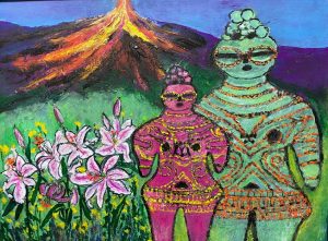 出展作品は、与謝野晶子が1911年発行された歴史的雑誌『青鞜』の創刊号に寄せた詩「そぞろごと」の中の第1節「山の動く日来る」をイメージしたものです。 「その昔、山は火に燃えて」という火山の様子と縄文土器の「遮光性土器」の女性像を組み合わせたものです。