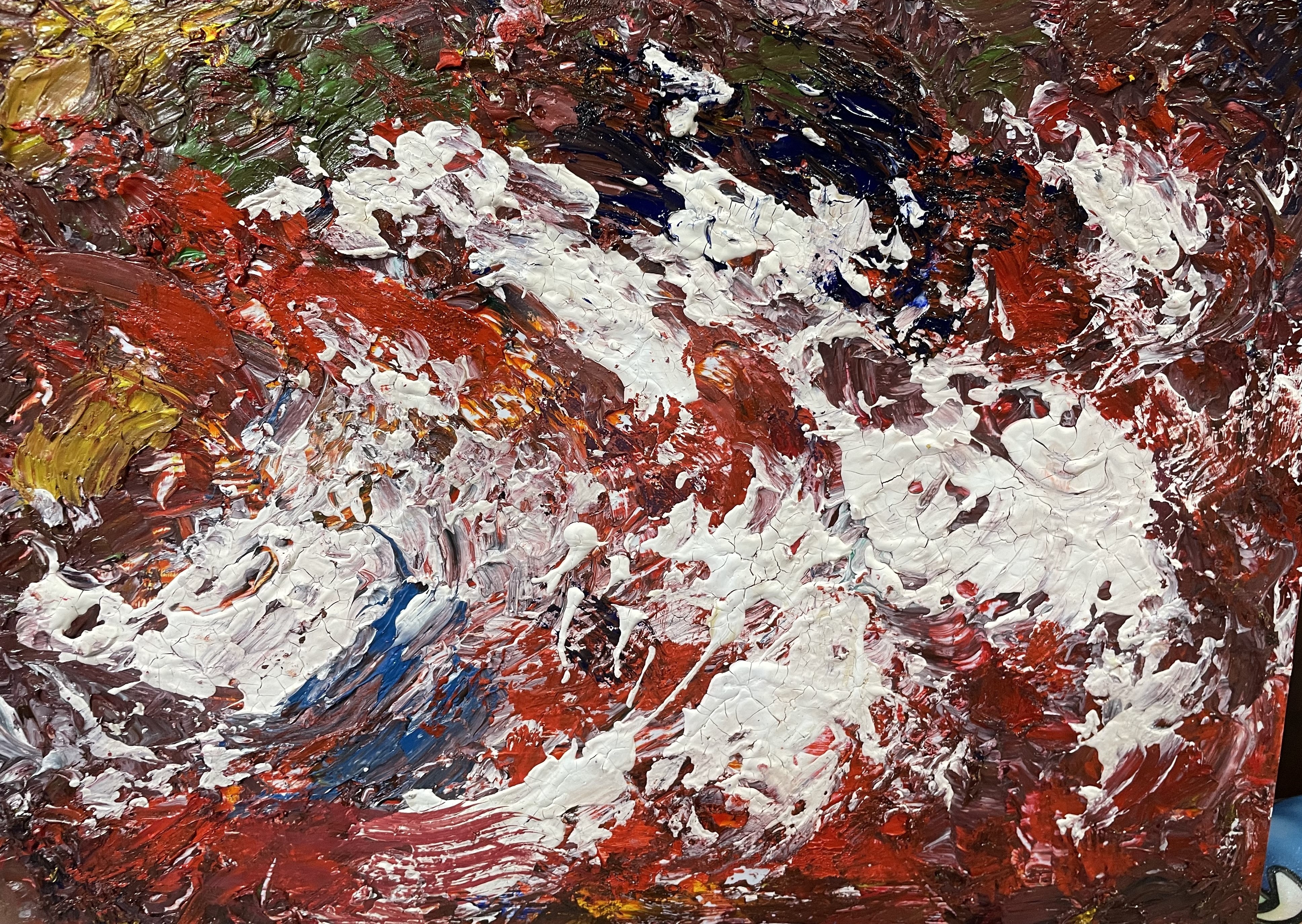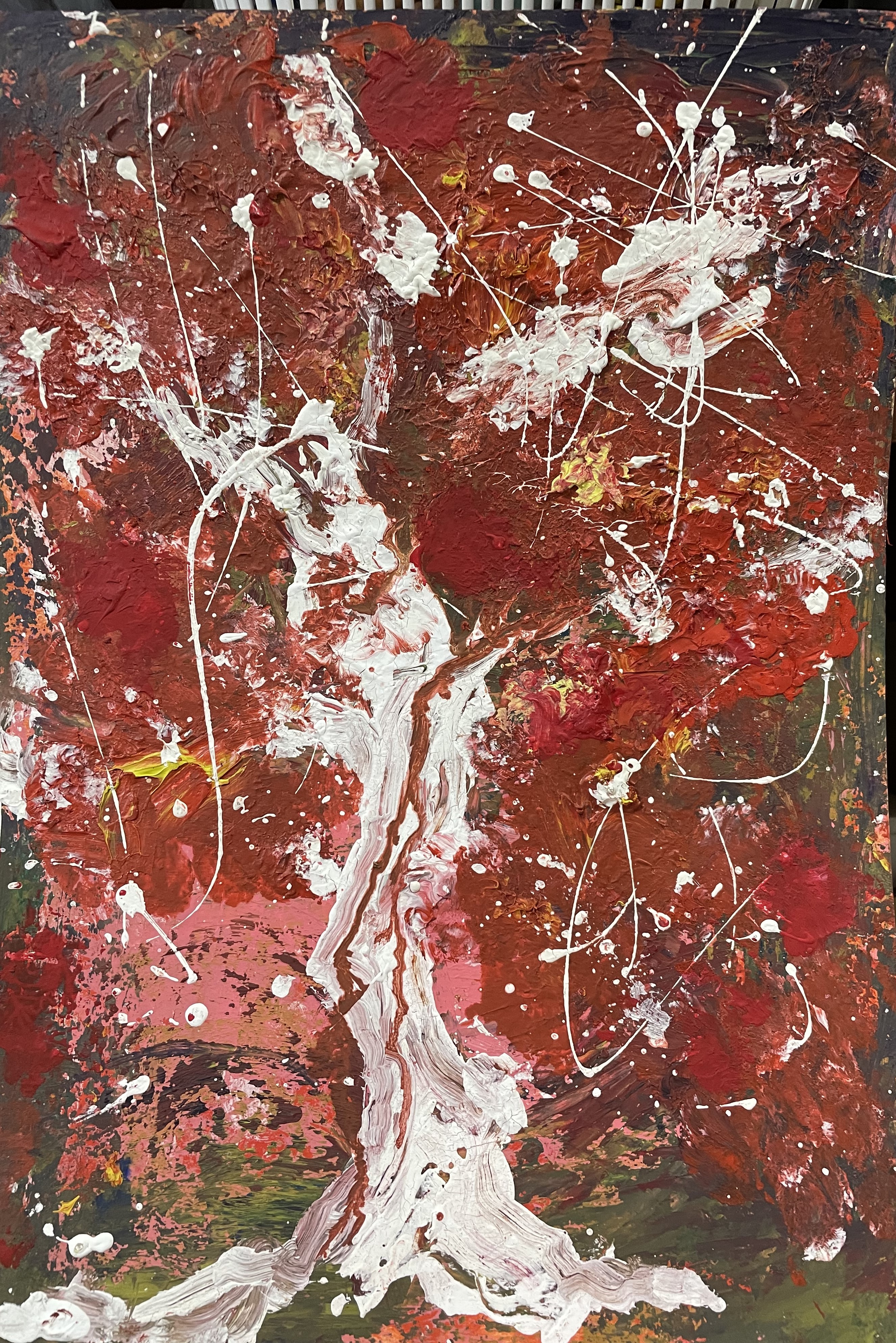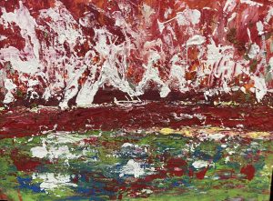 公募展の制作からやっと解放されて一息ついていました。私の中で自分の絵について新たな意欲が沸いていました。赤い絵の具をキャンバスに塗りまくりたい、それも勢いをつけて、がむしゃらに絵の具をぶつけたい!という気持ちでした。そして、より自分の中の本質」を明らかにして、それを引き出して描いてみたい、「その本質がどんなものか見極めたい」という気持ちでした。しかし、まだまだあいまい状態なのですが、ただ「赤い絵の具で動きのある線でむしゃらに表現したい」という気持ちがこみあげていました。これは間違いなくアブストラクト・アートへの接近です。
