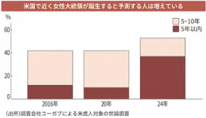 調査会社ユーガブによるアメリカの成人対象の調査では、アメリカで、近く女性大統領が誕生すると予測する人は、2024年は、『5年以内に誕生する』が37%、『5年~10年以内』は16%と倍以上が早い時期に、女性大統領が誕生するとみていると伝えています。願わくば早まってほしいものです。