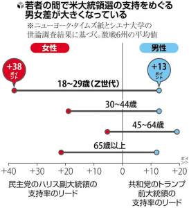 今回の選挙で男らしさをことさらに強調したのはトランプ氏でした。「ジェンダー平等と政治」にマイナスの影響を与える結果になったようです。「危険な世界にいるタフな男、それこそが大統領なのだ」「女性には無理なことだ」というメッセージをパフォーマンスが得意なトランプ氏は醸し出していました。多くのアメリカの若者、特に男性がそれを受け入れたのでしょう。投票行動では男性はトランプ氏へ、女性はハリス氏へ分かれたのが特徴でした。特にZ世代(30歳未満者)ではジェンダーギャップが明らかになったと伝えられています。下の図は選挙前の2024/11/01の調査結果です。(読売オンラインニュースより)
