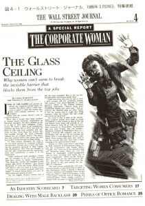 その後、ウォールストリート・ジャーナル紙が1986年3月に掲載した女性の昇進をはばむ企業文化に関する特集記事で『ガラスの天井』という言葉を取り上げ注目を集めました。このとき、アメリカでは女性の企業での管理職比率は35%%でしたが、記事には「35%にしか過ぎない」と報じています。この記事が出た後、「ガラスの天井」という言葉は、広く世界中で一般的に用いられるようになりました。私はこの記念すべき記事を手に入れようと、NYでウォールストリート・ジャーナル社に赴き手に入れました。下の記事がそれです。