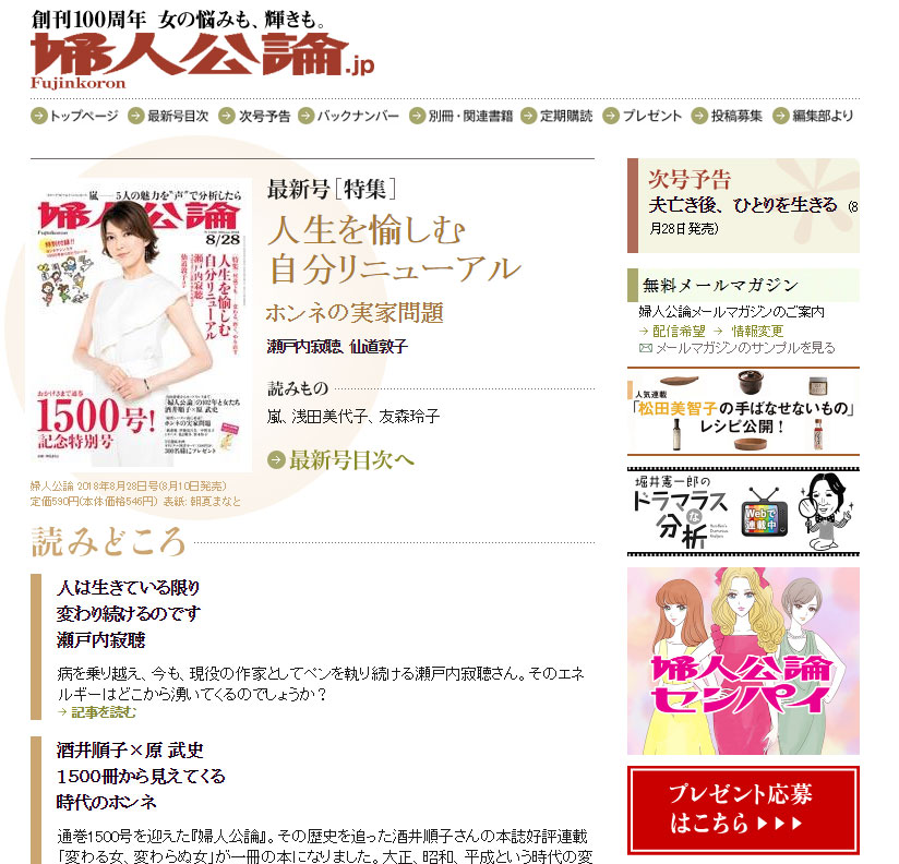 『婦人公論』は2018年8月28日で1500号を迎えました。1916年(大正5)年1月に創刊され100年の歴史を重ねました。『主婦の友』『婦人倶楽部』が家庭の主婦向けとされていたのに対し、『婦人公論』は当初から「現代婦人 … Read more »
