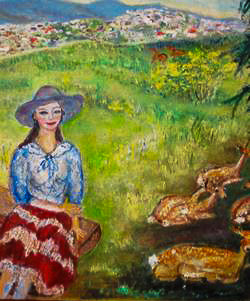 もともとはした半分の10号だったのだが、別のキャンパスに上半身を描き、変形サイズとなった。背景はイスタンブールの夜景。ベリーダンス嬢はとても幸福そうな顔にしたかった。男性ダンサーもいるのがわかる?