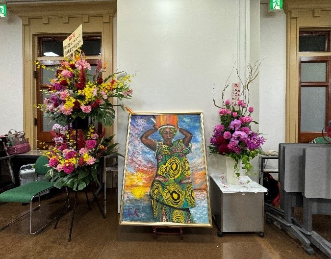 前日からの雨も上がって、秋晴れの中之島中央公会堂です。午前9時から準備に入りました。専門家が2人、助けてくれる人17人で、70展の絵画を配置、設置していきます。まずパネルを地下の倉庫から運び出します。ミリ単位で設計図を作成した入念な準備が効を奏して、パネルにぴっちり並びました。圧巻です。お祝いのお花も次々に運び込まれて展覧会モードいっぱいです。