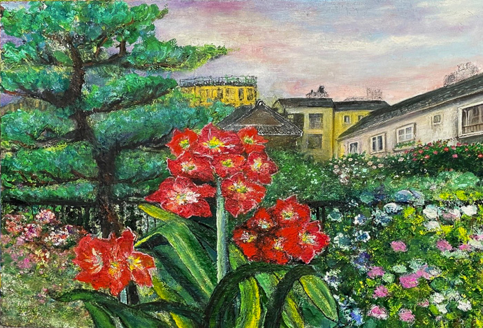 今月の1枚は、夫の逝去からの3年間を思いながら、アマリリスの花を描きました。私が慌てふためいたあの日の朝も、玄関のドアを開けるやまっすぐに立派に咲いているアマリリスが目に飛び込んできました。その後1か月も咲き誇っていたアマリリスです。玄関あたりはその後リフォームで変えてしまいましたが、描いた情景は3年前のままにしました。紫陽花が繁茂していて、外出するのが苦痛になっていた私をさらに家に閉じ込めるように玄関口をふさいでいました。大木になった松の木はあたりを薄暗くしていました。2年前のリフォームで、紫陽花もほとんど伐採し、大木も引き抜き、門扉も変えました。その後、玄関の前方の家並みも変わりました。新しく5階だてが並びました。
