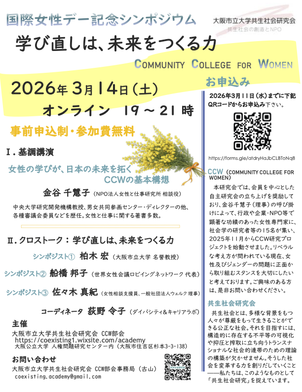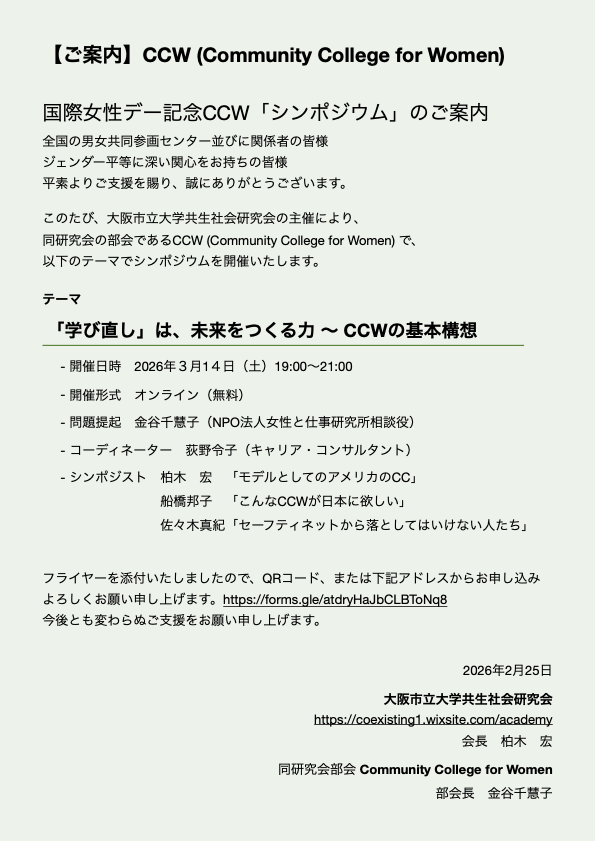 [お知らせ] 国際女性デー記念CCW「シンポジウム」 koechi 2026年2月27日2026年2月27日 01_GOLDENシニア生活-Women’s Activistとして・03_CCW-Community College for Women